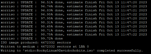 mkisofs -o RockyLinux9Davidochobits.iso \ -b isolinux/isolinux.bin \ -no-emul-boot \ -boot-load-size 4 \ -boot-info-table \ -R -J -v \ -V "Rocky-9-0-x86_64" \ -T /opt/kickstart/rocky9
